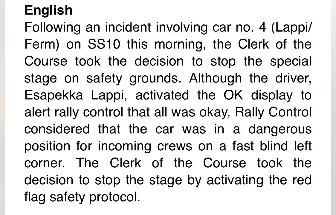 it remains fishy to me. why did they only decide it was dangerous after the 4th car was about to pass? why did they decide it was so dangerous to cancel the stage while we have seen on many occasions that they normally just leave the cars in place, even on much more dangerous places?