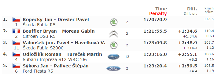 Fabia R5 was visibly more powerful than anything except some WRC cars. It was especially notable on the first extremely fast circuit stage where Kopecký was chasing Pech. He was getting closer and closer especially on straights. If there was another lap he would be on Pech's rear bumper.