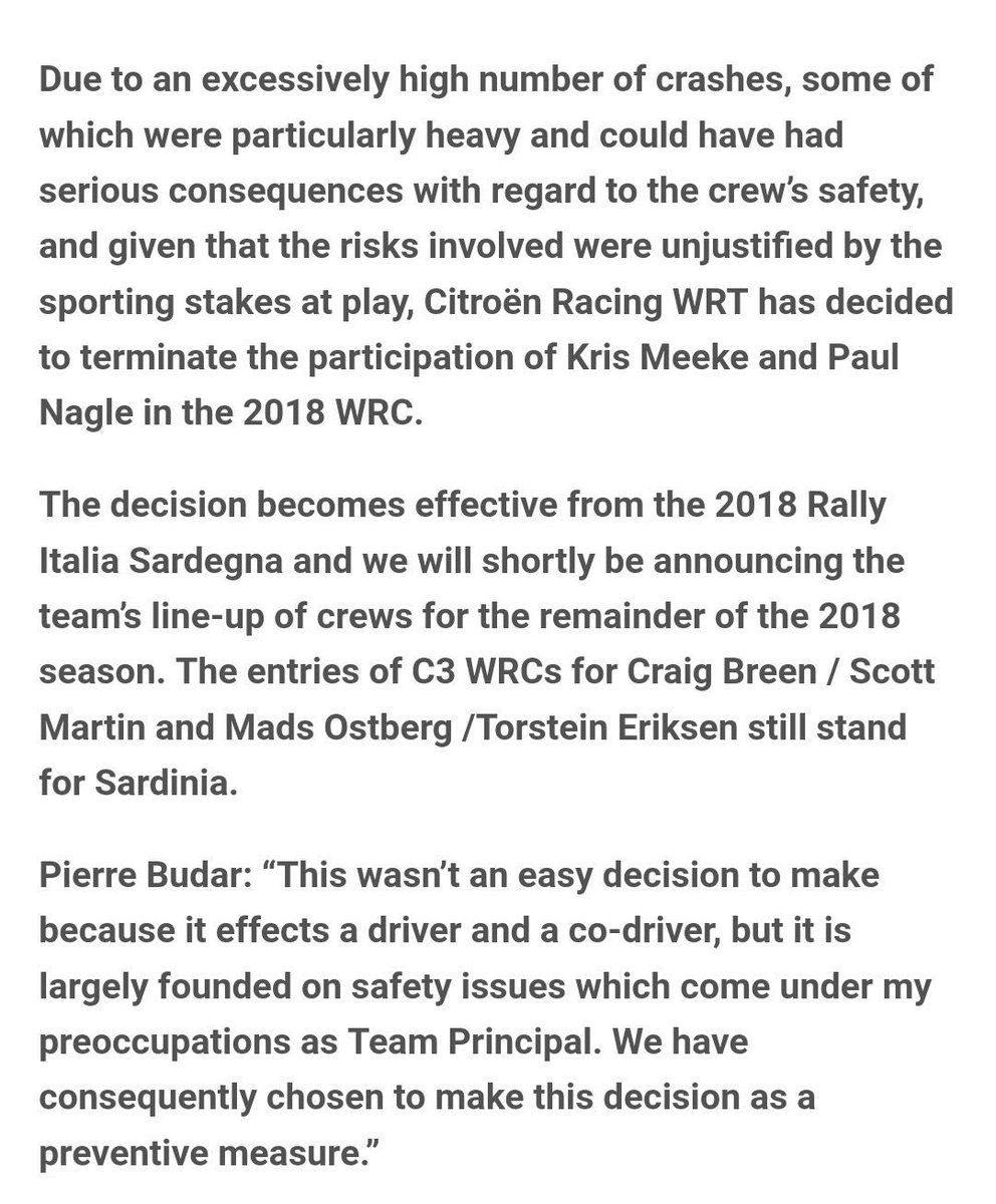 As for Meeke's own social media post. Let's be real Kris isn't sat there at his computer doing this all himself. His brother Barry does his social media for him so it could be that this post has been ready for a while and it just was posted unfortunately very close to Citroen's announcement. You'd like to think they told him more than an hour before slapping out the press release. Or I guess it could have been deliberately timed to make Citroen look bad. Who knows - the comment about the support of Budar particularly stands out. But maybe just with hindsight.